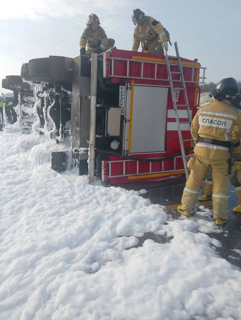 На фотографии с места происшествия запечатлена пожарная машина, лежащая на боку в разлившейся пене.