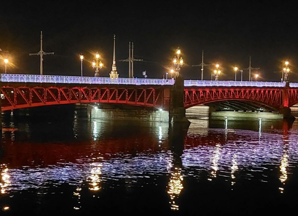 Сегодня в честь юбилея Федеральной службы войск Национальной гвардии Российской Федерации 3 петербургских моста — Дворцовый, Троицкий и Бетанкура — окрасятся в краповый и белый цвета.