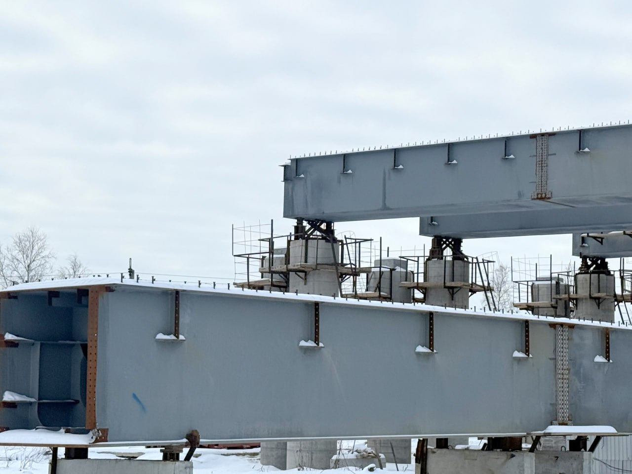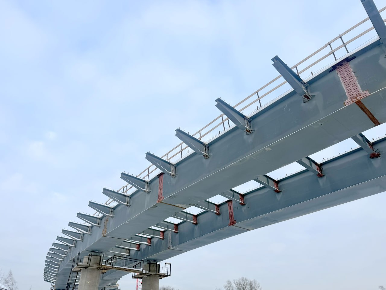 Вместе с тем балки закреплены на всех готовых опорах, благодаря чему виден масштаб и образ будущего сооружения.