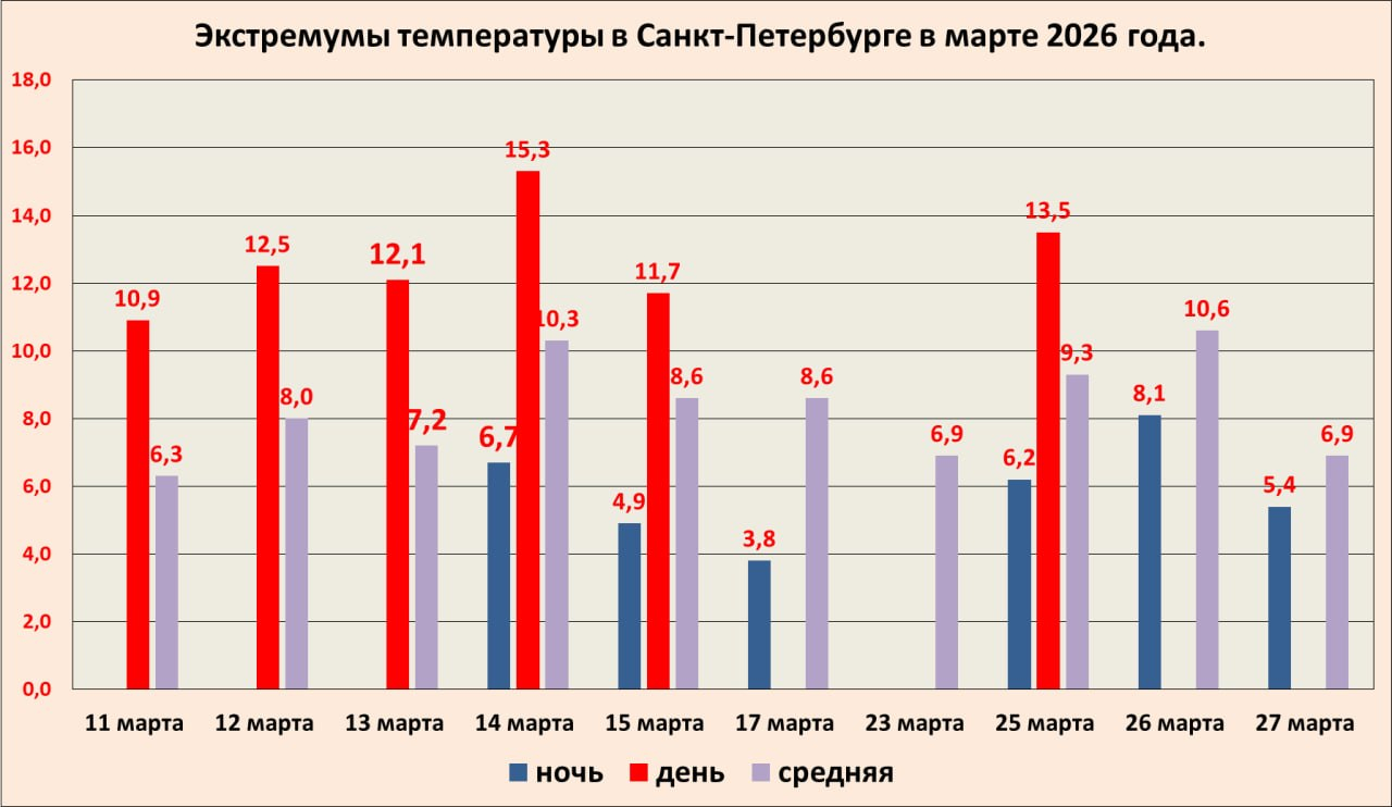 Особого внимания заслуживает ночь 26 марта: температура +8,1 градуса стала абсолютным рекордом для марта в Санкт‑Петербурге. Прежде отметки выше +8 градусов в ночное время в этом месяце никогда не фиксировалось.