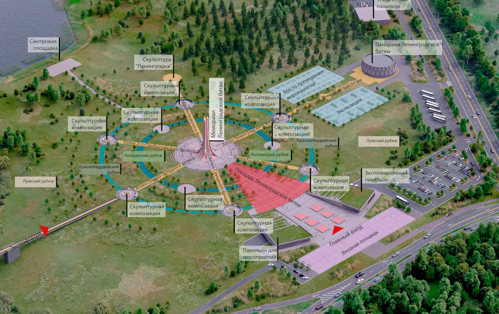 Мемориальный комплекс планируется разместить на территории, где в годы войны шли ожесточенные бои. Он будет состоять из шести аллей Славы - по числу фронтов, участвовавших в Ленинградской битве. Предусмотрены павильоны, в которых будет представлена музейная экспозиция о героях Ленинградской битвы и интерактивная выставка.
