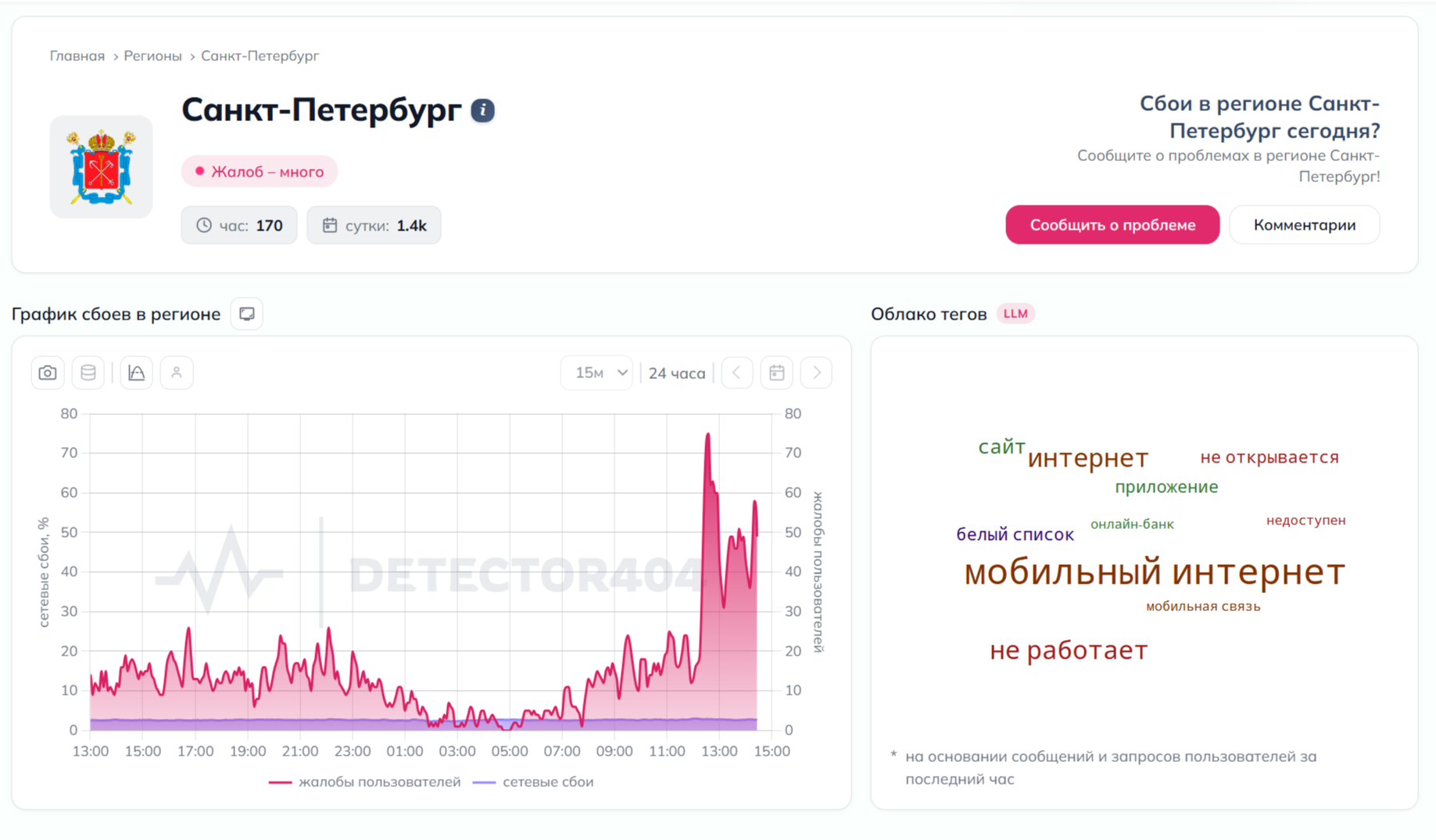 Днём 27 апреля петербуржцы столкнулись с массовыми сбоями мобильного интернета. Только за последний час количество жалоб выросло до 170, следует из данных сервиса downdetector.ru.