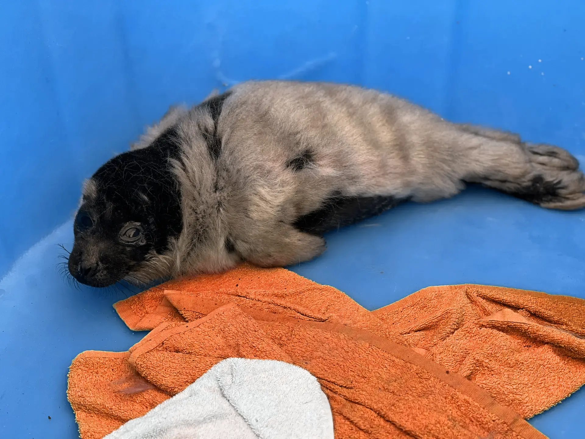 Вторую нерпочку обнаружили в районе Кильпола. Она ползала под дождём за людьми на берегу. Судя по свежей пуповине, она родилась за день до этого, сразу потеряла связь с матерью и сильно переохладилась.