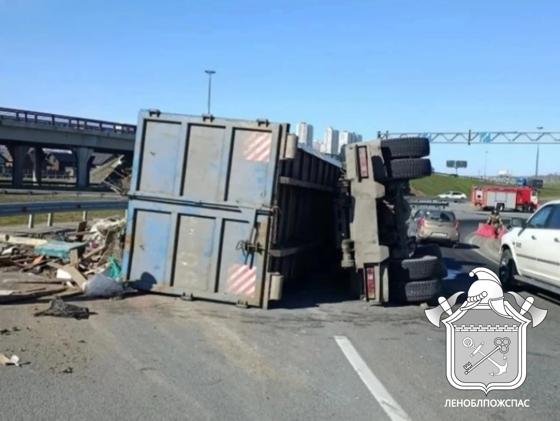 Пресс-служба ГКУ «Леноблпожспас» сообщает, что водитель грузового автомобиля «КАМАЗ» не справился с управлением, в результате чего машина опрокинулась на левый борт.